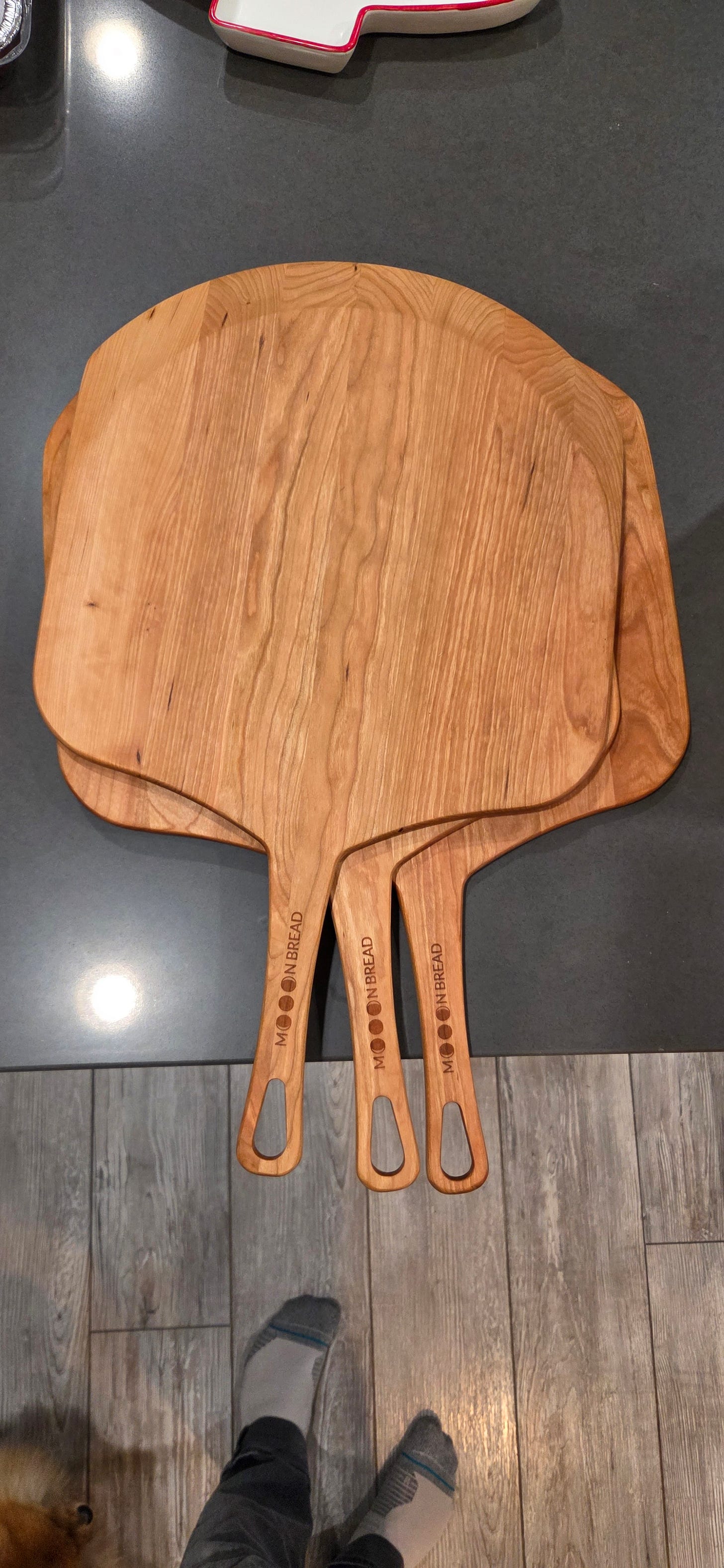 Mooon Bread Pizza Peels. Great for 14” pies and pairs perfectly with Baking Steel for home pizza. $54 each. Reply now to order one. MOOON BREAD BOARDS: I have a fresh batch of Mooon Bread Boards that are going fast. Remember these work as a cooling rack, have slats and a crumb-catching tray. Various woods. They are too beautiful I’m not even going to share a photo right now. Reply and I’ll send you current inventory.